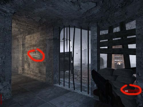 僵尸模式进入后,你只有一把手枪和2个手雷,手雷每关都会给2个,子弹也会自动加满。图中右边红圈是杀僵尸所得的分数,可以兑换武器弹药,进入默认是500点。