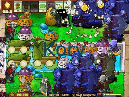 6、后期大量出现的蹦级僵尸,用冰蘑菇,然后快速判断不能靠冰冻西瓜打掉的重要植物之上的蹦级僵尸,用玉米炮。