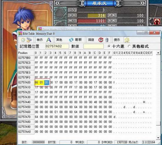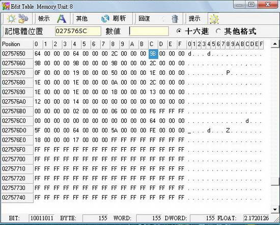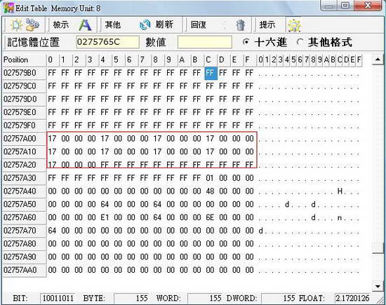 步骤3、回到编辑记忆体 往下拉一些(不过怎麽变动都在这个位址)就会看到17 00 00 00 17 00 00 00 17 00 00 00.. 以此类推我们可以看成 天阳绝00 00 00 天阳绝 00 00 00 天阳绝 00 00....以此类推