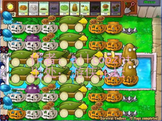 注意事项:三 不停的给单个位置建筑更新南瓜罩,我一般带一个复制一个南瓜罩,主要给第1列冰西瓜,第3列向日葵,水上2石头更新,南瓜罩一但稍有损坏,便可以套个新的,不要等到没了再补,肯定来不及。而且南瓜罩可以说是图上唯一价格不会增长的建筑,100块,几个双头向日葵便可支撑住其花费。