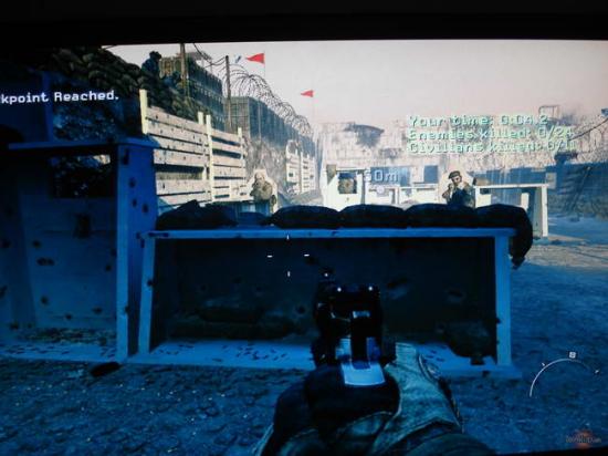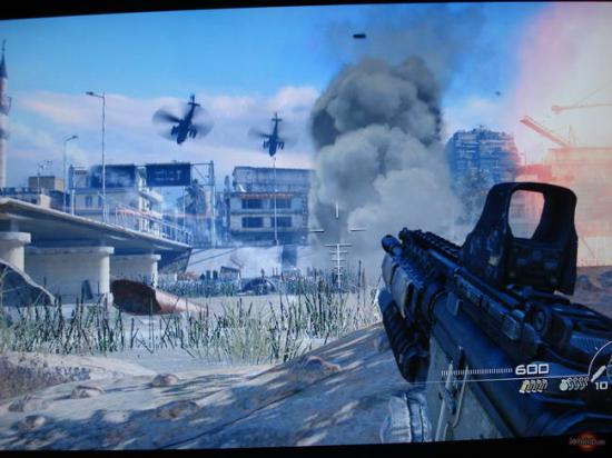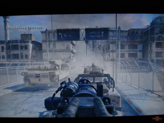 此段路路途可以欣赏周围的景色(?!景色?- -),注意虽然可以开火,但是不要攻击平民,否则任务立即宣告失败。遭遇到攻击后就可以开始还击了,敌人大多位于楼层之上,而且持有RPG,所以要快速解决。悍马车被炸毁后,会处于大批敌人包夹之下,在8点,9点,11点以及2点的位置处均有敌人,所以要立即后退以车体作为掩护然后予以还击,随后找机会进入2点位置的房屋。房屋里面有AK可以拾取,随后上楼清理掉敌兵,2层尽头有几枚RPG,捡起来将对面建筑的敌人轰杀至渣吧。杀的差不多后,跟随部队突击对面建筑,小心建筑内部走廊右侧的教室有敌人隐蔽。来到2层后先用手雷作为掩护,再一口气搞定敌人。