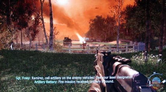 任务回到夕阳西下城市战场中,任务开始后随部队前进,部队中有一辆装甲运兵车作为我军的掩护。按下方将键“→”可以通过激光引导装甲运兵车攻击目标,多多使用可以轰杀掉不少敌人。通过装甲车的支援,依次将2点钟方向的橙色,黄色和灰色房屋中的敌人清理完毕。下个敌人聚集地是10点钟方向的大型建筑,由于敌人火力过于猛烈,所以暂时不要跟随队长冲到太靠前的位置,在后边慢慢WS就可以。搞定这片区域后继续前进,在一辆消防车的背后有敌人的自动格林机枪,还是让装甲车上前搞定吧。