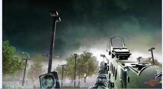 继续前进过桥,中途会目睹一架飞机坠机的过程。前边又会杀出大片敌人,要小心应付,在装甲车前进到底后,3点钟方向有一幢别墅似的建筑,建筑内部敌人较多,不可贸然冲入,先用手雷伺候再找机会突入。通过建筑区域后,前方开阔地带有两处敌人对空高射炮,使用“→”键呼叫炮火支援摧毁即可。随后到达目标地点捡起尸体旁边的手提箱即可完成本任务