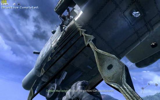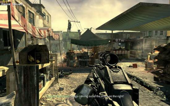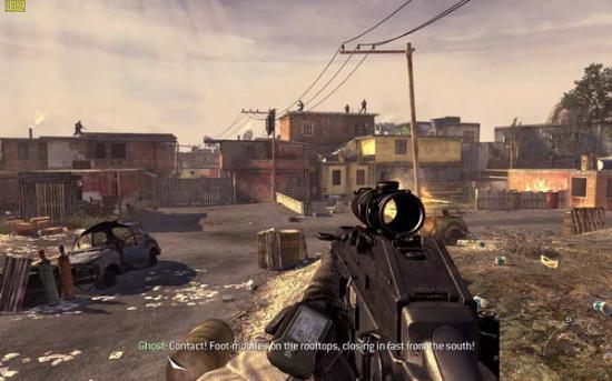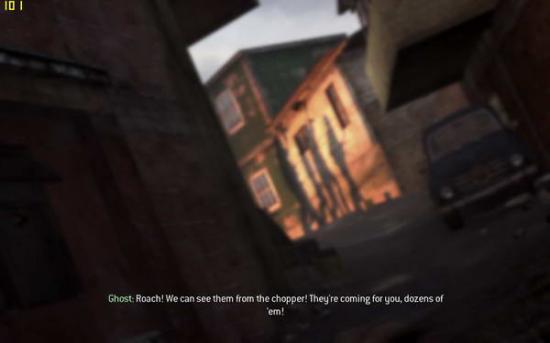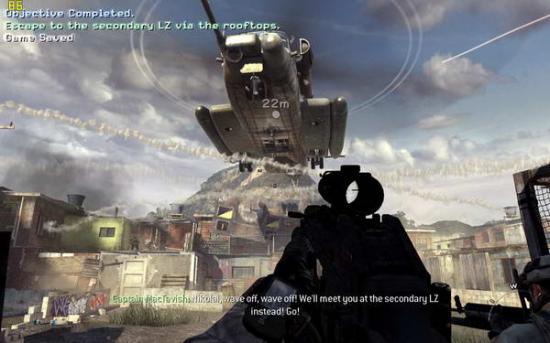 接下来这一关,你的视角回到了和soap在一起的roach小队,你们要逃离已经开锅了的贫民区。出来迎面就是一片开阔地,屋顶上都是狙击手,地上还有一辆重机枪的汽车(图1),一不小心就会挂掉,所以趴在地上收拾他们吧。继续前进,来到一个貌似农贸市场的地方(图2),不得不赞叹游戏做的很精细,鸡都是可以打死的。。一路前行,小心埋伏,就会来到上代soap曾经救了的尼克莱开的直升机的landing zone,但是漫天的rpg迫使只能改换地方(图3)。跟着soap攀上屋顶,注意跳跃不要掉进下面,最后直升机近在眼前的时候roach不慎掉落,眼前出现民兵的影子(图4)。。。不要犹豫,站起来往前跑!前面是单线的路,通过楼上回到屋顶,会有30秒倒计时,夺路狂奔吧,最后在直升机处助跑跳,就可以逃出升天(图5)