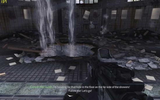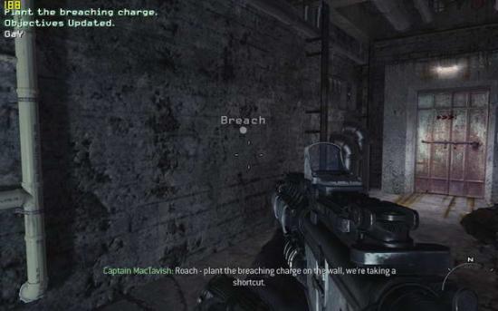 这一关,我们要从监狱中救出一名神秘囚犯(不是已经剧透了么。。。),乘坐直升机前进,F15战斗机会进行火力支援(图1),哈哈,抄起手里的M14,不要放过任何拿着rpg或者试图操纵防空导弹的敌人。在直升机的掩护下,跟随小队进入地牢中,一直前进是监狱的控制室(图2),ghost留下来监控开门,我们和soap去营救人质。跟着soap来到底层,等待ghost开门,最后来到一个军械库(图3),ghost试图开门,结果被敌人锁住了,这时候敌人发起来围攻,赶快捡起防爆盾靠墙蹲着,等待开门后冲出去,在敌人面前按E用盾把敌人砸死(图4)。在通道的尽头绳降到地牢最底部.前面的通道没有灯,需要按N打开夜视仪(图5),挨个检查以后发现空的就是敌人,出去以后摘掉夜视仪,继续前进的通道有管子,小心不要被喷出的火烫到(图6),然后炸开一扇墙(图7),进入一间大浴室里面(图8),在这个模仿了勇闯夺命岛的场景里面,敌人从浴室上方扫射,还有防爆盾来强推,而你的目标则是跳进尽头的洞里面(图9)!到了下水道当中,从一个滑坡滑下,再炸开一扇墙,我们面前的是:Price!(图10)soap感动的把手枪递给他(图11)(图12),这时候海军的轰炸开始了,整座城堡开始崩塌,赶快跟着队伍逃跑,就在眼看就要登上直升机的时候通道坍塌,不得不回头向一个岔路逃,谁知却还是死路一条(图13),roach被石头砸晕,soap放出信号弹,直升机从洞中放下绳索,带着四个人在最后时刻逃出