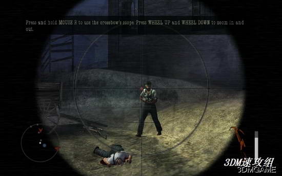 先杀掉敌人拿到弩箭,和狙击枪差不多,可以滚轮放大缩小,打头一枪。