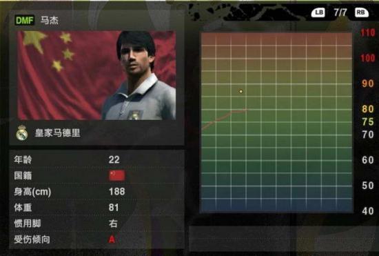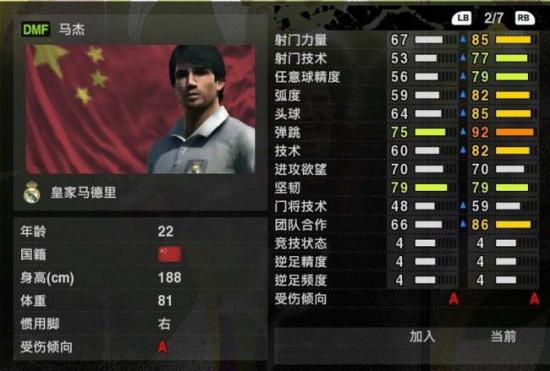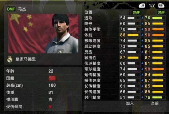 这样,进入职业生涯的后腰就得到了88的体能,66的长传速度,67的射门力量,75的弹跳和70的进攻欲望。