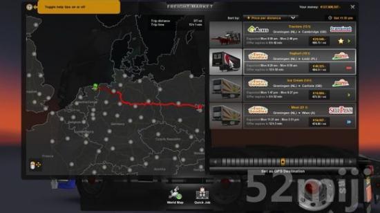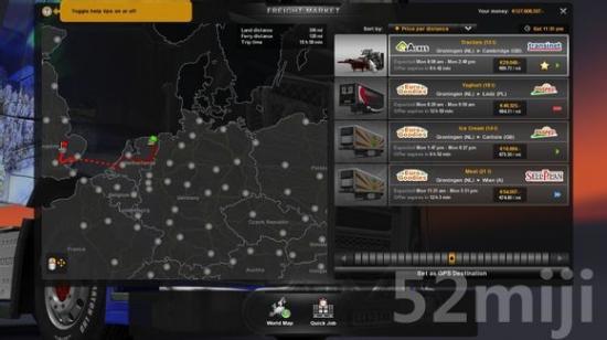 从欧洲大陆到英国的轮渡或者隧道,这段距离是不计算在单价内的。也就是说,单价等于任务报酬除以陆地上跑的距离。而有些轮渡是伤不起的,像那个16个小时的轮渡。因为你欠银行的钱是按天还的。所以,在选择任务的时候,不仅仅看单价,还要考虑一下时间。刚才提到那个轮渡花16个小时,足够你再跑一次中长途任务了。