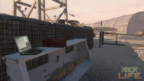 左方的笔电(Intel item)就是游戏需要收集的隐藏物品,收齐45台可解成就与增加战役完成度的百分比。笔电的位置大多在主要行动路线之外,例如这个阿富汗基地的笔电位置是:背对靶场走到最远的那一端。
