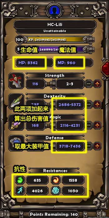 属性点《火炬之光》的人物属性分为:Strength(力量)、Dexterity(灵活度)、Magic(魔法)和Defense(防御),还有HP(生命值)和MP(魔法值)。如图:
