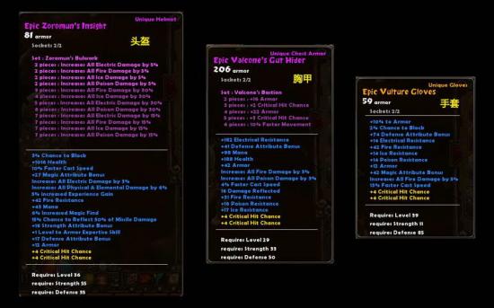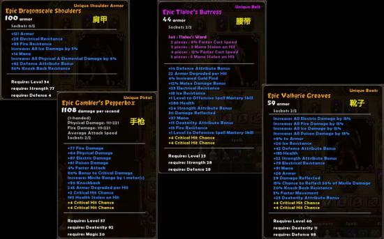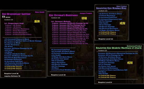 d)紫装(紫字、套装,分为Unique唯一和Rare稀有两种,Unique紫装属性固定,Rare紫装则不固定属性;套装在多件成套后会有附加套装属性)。