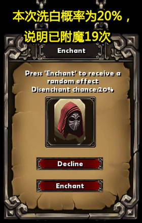 除了洗白,在附魔过程中还有一定概率出现什么都没发生,此时装备维持附魔前状态,包括附魔次数也不变。这样的概率我估计有1/10,不过似乎和附魔洗白没有任何关系。我曾经连续4次出现什么都没发生的状况,但第五次并不是洗白装备。