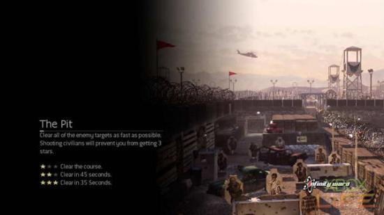 Special Ops模式的Alpha任务第一关The Pit,就是阿富汗营区内的CQB训练场。老兵模式难度下,玩家必须在35秒内跑完全程且不能误击平民标靶,才能取得三颗星评价。笔者建议玩家在场外挑选武器时,尽量挑选单一弹夹装弹数量高的枪械,例如M4A1、ACR等。如果玩家是独自一人挑战任务,可以携带一把高弹量步枪以及搭配一把小手枪,这样可以在跑位空档时切换成小手枪来射击。二位玩家合作进行任务时,可以採取一左一右的攻击方式,只要二位玩家负责自己射击范围的标靶,在这裡取得三颗星几乎不会是难事。