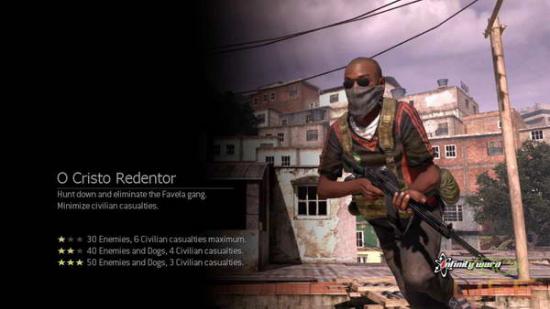 O Cristo Redentor:从这个任务开始,玩家渐渐能感受到Special Ops模式裡老兵难度的威力,敌人不仅会从四面八方窜出,甚至会躲在门后乱枪扫射玩家,让不少新手玩家恨之入骨。任务开始时,强烈建议玩家一定要入手这把挂有心跳感应器的霰弹枪,即使这把武器子弹用尽也不要把它换掉,因为心跳感应器可以帮助玩家找到敌人的踪迹。这裡除了要杀掉五十位敌人外,还必须在最多误杀六位平民的情况下完成任务,因此玩家在开枪先最好先看清楚再攻击。