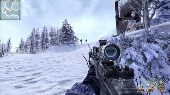 最后来到离目的地71M处,抬头一看就可以发现最后的二位敌人,快速狙击他们后就可以滑下山坡抵达目标。