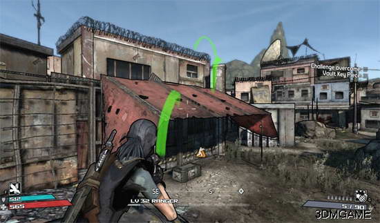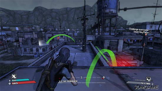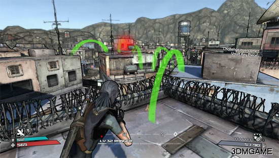 到屋顶后按指示跳。 但第二次跳跃有点远,要不放心就从人物的左边走可以到这张图片人物正上方的那个绿线跳跃那去,那很近