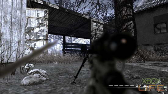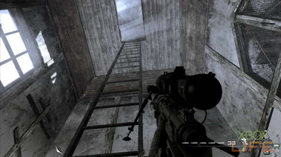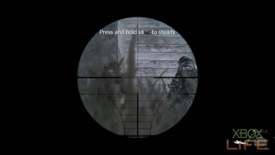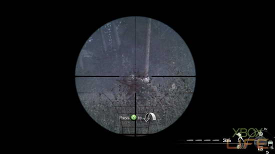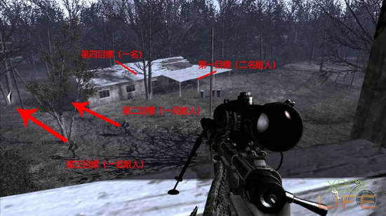 进入教堂从左侧爬至阁楼,这裡是个绝佳的狙击地点,当看到敌人时最好仔细观察敌人的动向。当第二、三目标走至箭头标示处会原地不动,此时玩家就能先处理掉第一目标的二名敌人,紧接著逐一狙杀二、三目标。照此方式攻击后,第四目标会从屋内衝出来察看伙伴,二话不说赏他一颗狙击子弹。