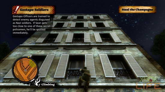 到达目的地后,玩家可选择硬上或者是用偷窃的方式进行任务。从一旁边的民房窗户爬到顶楼,仔细观察地形,不难发现有一条电缆刚好可以滑行到香槟上方,藉由电缆跳到香槟所展示的地点后,立即把它给取走就可以回报任务。如果玩家不巧被纳粹发现被通缉时,还能利用一旁的藏身处躲避降低通缉值。