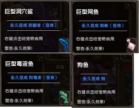 这个应该是召唤法师的最爱,不同的鱼能使宠物生命,攻击,防御及攻击方式发生巨大的改变。