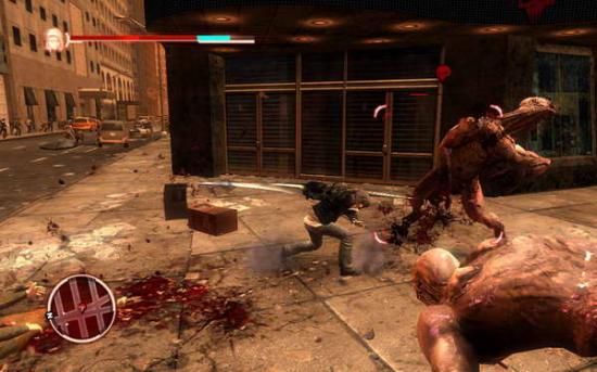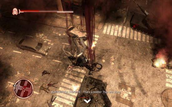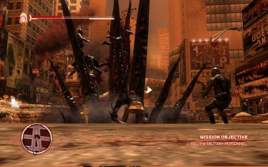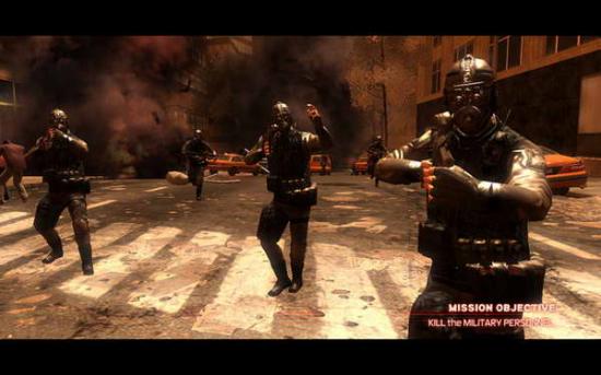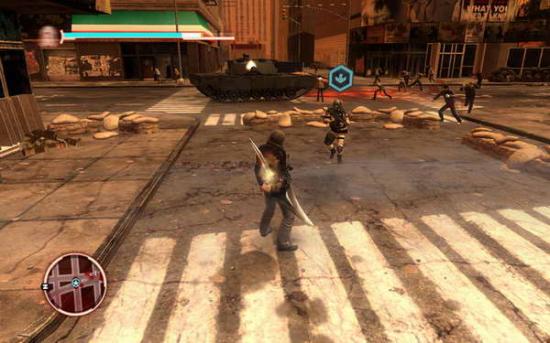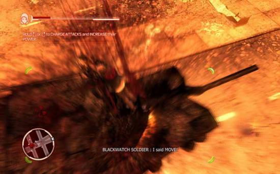 到处都是感染的人群,头顶有红色箭头的士兵就是目标,如果走太开了,可以看小地图找出来。这里要肉搏,上前左右键交替使用,主角的功夫其实还不错的。或者你可以捡起他们的枪,自动锁定,直射就是了。