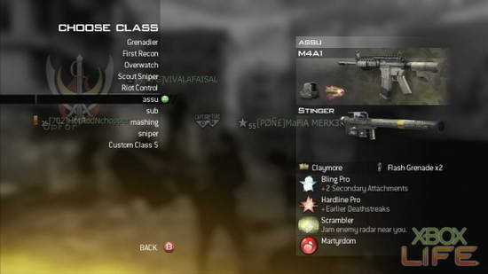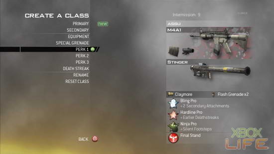 等待开场前,建立新装备组合。这里可设定主要与次要武器及枪枝配件,第3、4项是设定装备(例如地雷或飞刀)与特殊手榴弹。中间有3种类型的PERK与连死技能设定,最后面两项为装备组合命名与重新设定。设定的结果会呈现在右方,详细PERK技能说明请参阅文底附注。退出选项且储存后,下次可直接选择这项装备组合而不需重新设定。装备的枪枝配件与PERK会随著杀敌逐渐累积经验值而升级,升级后能取得其他装备和进阶技能。
