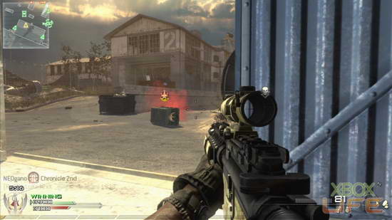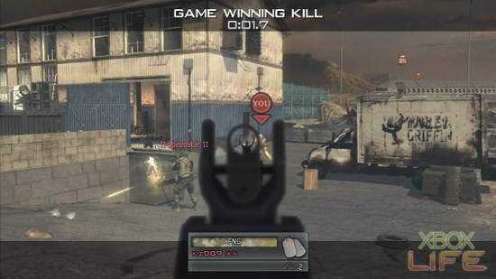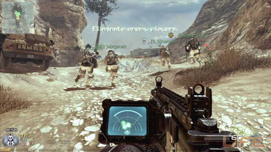 左下角显示战斗时间10分钟倒数,时间到0或是某队分数达7500分就结束。左上的雷达萤幕,友军以绿色表示,被发现的的敌军以红点表示。枪枝上装备的心跳侦测器,适合侦测转角与牆壁后方的敌人。