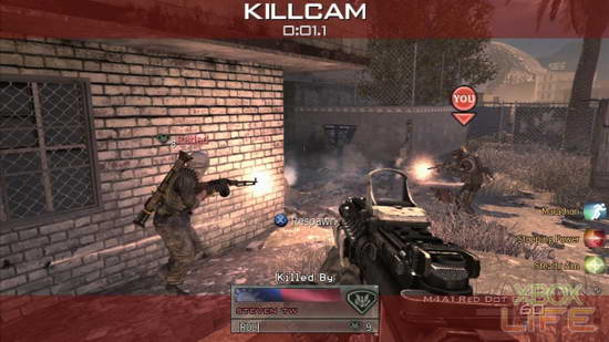 战斗中死亡可看即时重播,瞭解敌我相关位置,若按X键则立即跳出播放画面而重生。有YOU图样就是玩家的角色,正专注攻击左方敌人,被画面中央的玩家由左侧攻击。中央下方可看到杀手的图示与代号,难得有游戏可设定中华民国的国旗,真是感心呢。