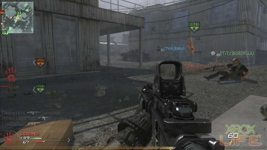 雪地的夺旗作战,服装是看玩家的主武器由电脑配发,在右下方的队友选择拿狙击枪,所以会自动穿上狙击手专用的伪装服,能够融入雪地背景。若想当忍者背刺敌方,装备狙击枪以获得伪装服也是一种选择。左方的队友背盾牌奔跑活像忍者龟,对背部有防弹效果喔。