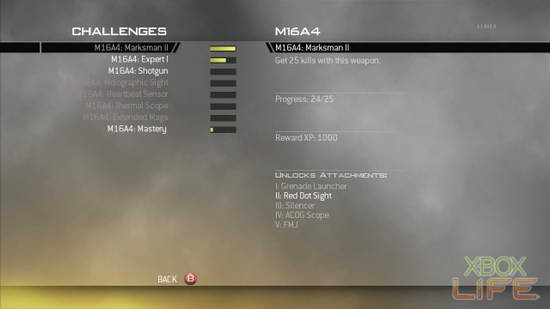 枪枝配件的解锁攸关射击的速度与火力,只要多用某一把枪作战,满足使用条件且累积足够杀敌数就会升级配件且增加大量经验值。例如在40级取得的M16A4这把枪,画面右方显示杀25个敌人可获得内红点以及1000点经验值,目前已杀了24人。若将来再透过取得的内红点杀到一定数量,可获得有放大倍率的光学内红点。