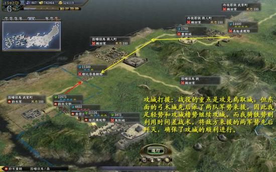 实例:攻城打援——我方攻打鸟取城,敌方从东面的弓木城先后派了两队军势来援,为保证攻城的顺利进行,我方足轻势和攻城橹势继续攻城,而对建有石垣的城破坏力弱的骑铁队,则运用第二种时间差战术,先后歼灭敌之来援,为我方顺利攻克鸟取城创造了条件。