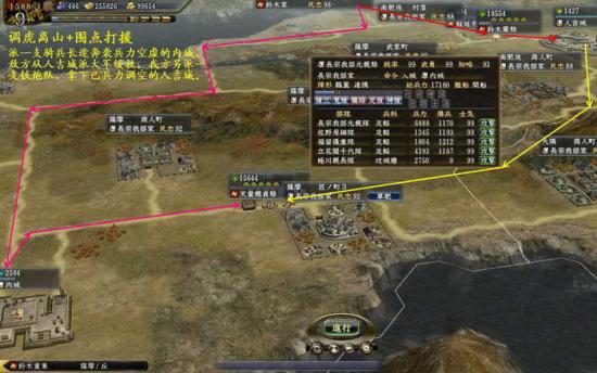 实例:我方(82国替铃木)攻略九州只剩长宗我部的最后三个城(人吉城、内城、肝付城)。我方同时派出两支部队,一支铁炮队缓慢向人吉城进发,另一支骑兵快速奔袭敌后方兵力空虚的内城,敌果然从人吉城调兵救缓内城,我骑兵便可乘机与敌之主力在野外作战,发挥我骑兵野战能力强的优势。另外,我方待人吉城主力出城后,再另派兵攻打兵力大减的人吉城,轻松克之。此计,亦有调虎离山、声东击西之效。