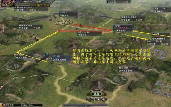 实例:我方在玉藻狡杀战中,多次采用第二种时间差战术,用足止令敌方兵团各军势距离拉大,从而令我方能各个击破。