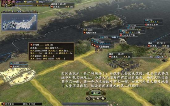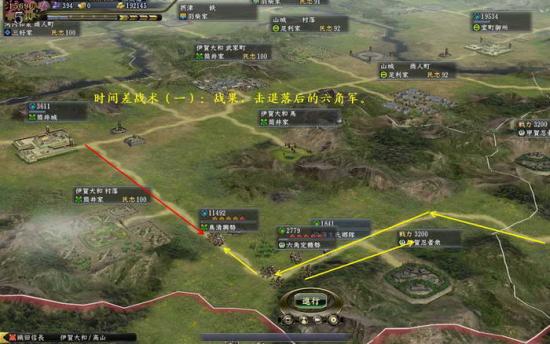 实例(群雄):我方为筒井,受到足利和六角联军的同时攻击,我方已事先在通向室町御所和观音寺城的方向建了砦,而六角军到达筒井城的路程比足利军要长不少,我方利用东北面的砦暂时阻挡六角军,同时出动主力先击退足利军,然后再回军攻击与六角军。下图中,我军已基本击退了足利军,而六角军还没能攻破我方的砦,因此时间差战术已成功了一半,下一步就是回城恢复士气后,再出兵击溃六角军。(注:此局面常会出现,玩家选择筒井家,或选织田家攻下雾山至筒井一线后,也常会出现此局面。)