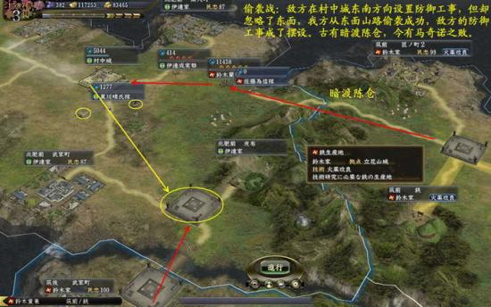实例:敌方在村中城的东南方面布下了层层防御工事,意图阻止我方进袭,但忽略了东面的防御。我方出其不意从东面山路奇袭,令敌方的“马其诺防线”变得毫无用武之地,此亦为暗渡陈仓之计。