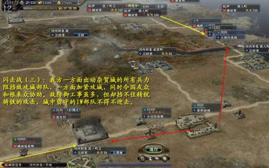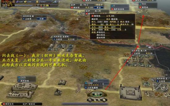 实例(群雄织田):我方(织田)刚刚攻克杂贺城,兵力未复,阵角未稳,三好家趁机发兵欲趁虚而入。但我方早有防备,在筒井城集结了1W马和1W铁炮,马上筒技术也刚刚研发成功。岸和田城原有2.8W余人,我方筒井和杂贺的兵力少于它,本来是不可急图的。这次三好出动了一半兵马,却给了我方以闪击战的良机。