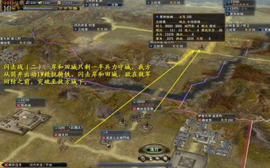 闪击战:也叫闪电战,是二次世界大战初期德军反复运用、大获成功的经典战术,其核心就是用高技术、高机动的兵种,闪电奔袭,以最小的损失,迅速、突然地达成最大的战果。闪击战有三大要素——奇袭、集中、速度。在天道中,运动闪击战的最佳兵种就是骑铁,其次是骑兵,骑铁的高机动、高杀伤在大部分的实战效果上要强于骑兵,但在对抗建有石垣的城时就较难发挥作用。对于此类坚城,一般只能采用硬碰硬的攻坚战。