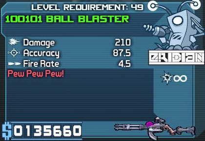 Ball Blaster,初看到时候我差点以为是又一把Eridian Blaster而丢掉,攻击准确射速属性说明完全一样,还好多看了眼名字才留下来。换上一用,跟踪弹呀!!!“无主之地惊现跟踪武器"这个大标题浮现在我脑海里。
