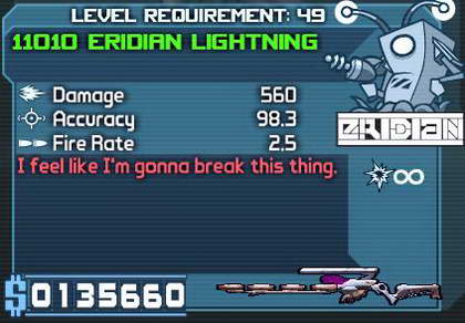 Eridian Lightning,外星狙击,我所见到的最后一种外星枪,打出来的是闪电,带电属性(废话),威力还行,但是耗能较高,一排能量只够打3、4枪,而且装备时候移动速度降低,更令我怨念的是……作为一把狙击,瞄准镜倍率那么低你好意思么你