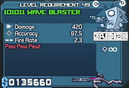 Wave Blaster,较高的攻击,电属性,子弹轨迹呈波浪形,碰到光滑斜面还会反弹(墙壁、钢板等),可惜实战中效果不佳,原本只需要看准星的,现在还要计算高度距离,不然子弹会从敌人头上绕过去,更别想爆头了 ,试打了几个敌人后直接丢进了背包……