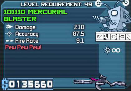 在Dahl Headland的外星遗迹,我刷到了我的Mercurial Blaster外星冲锋枪,低级版本只有90多攻击,同样无属性,但外星武器里最高的9.1射速,快速的子弹速度与较低的耗能,实际作战效果不俗,打中距离战斗专用。同样,一直用到Old Haven的高达战才换下,此后很少出场,刷到no water的红字SMG后更是再没出场机会