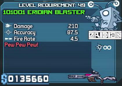 Eridian Blaster,二周目刷到,虽然当时因为是二周目的枪,比一周目的Mercurial Blaster攻击要高,但射速才4.5,而且中距离战斗已经开始用SMG,所以只能丢进包包里。49级版本后再跟Mercurial Blaster一比,完全是个弱化版,悲剧……