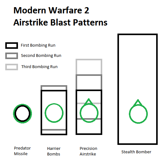 经过国外玩家们不懈的努力和无尽的试验,详细测算出了各类连杀轰炸的轰炸范围,下图从左至右依次为捕食者导弹(5连杀),鹞式(7连杀),精确空中打击(6连杀),隐形轰炸(9连杀)的具体爆炸范围。在开始之前做个友情提示,轰炸到手了大家能不能不要急着丢,我看到有人浪费隐形轰炸就极为痛心,就不能等个UAV看准再扔么。。。好了~下面是技术内容