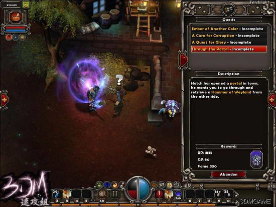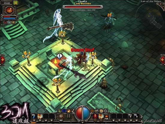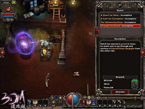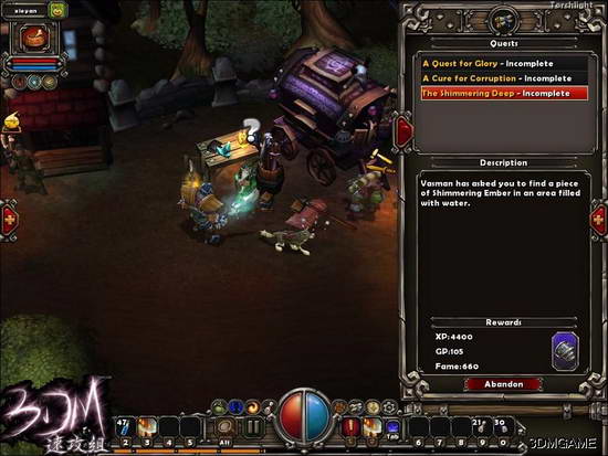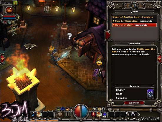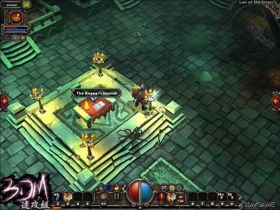 因为任务都搞定了,所以先回城交任务去。在机器人处交了任务后会接到同名的任务:(A Quest for Glory),任务要求玩家到到地下7层去干掉Batthrower the Red.Batthrower the Redd的样子就是带着皇冠的巨型白色幽灵,下到第七层会很快遇到,没什么难度。将(Deathlace Ember)交还给老头以后他也会给玩家一个任务:(The Shimmering Deep"深渊上的微光"),老头Vasman要求玩家在“灌满水的地区(area filled with water)”寻找名为(Shimmering Ember)的东西。在传送小站旁边的Hatch会再次打开传送门给玩家(Through the Portal)的任务,让玩家去寻找宝藏,里边的怪物不是很厉害,地图一共2层,这里就不多说了。通过刚刚打开的传送门回到地下,再向下一层,会来到名为(lair of the sisters"姐妹的巢穴")的地方....一路向前走会看见一张顶着省略号的桌子(The Keeper's journal"守护着的日志")点击后触发剧情,出现3个半透明的女性幽灵(原来"姐妹的巢穴"是这个意思,我想歪了)。干掉后向前走进入第七层。