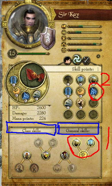 推荐搭配:除了被动技能按个人的兵种构成进行选择外,主动技能主要选择 红圈标志1 ,这是区域性增幅技能,将它加满时覆盖范围可达250米,如果加上装备的两级加成则可达到6级,覆盖范围350米,持续时间210秒,冷却60秒,攻防加成20%,除去其本身的攻防加成外,将两个分支技能加满怎可额外得到攻防各120%的加成,堪称部队厮杀时最逆天的物理系技能之一了,这是作为一军之统帅必修的王道;持续回血的技能我加到2级使用效果不明显,因而不推荐;红圈标志2 是所有类型英雄都可选择的伤害型技能……别问我为什么,主要是它实在太BT太暴力了,“闪电风暴”(乱起的名字 )4级时伤害达到800~3000,耗魔90,施法距离400米,覆盖半径15米,处于基本可以笼罩一个部队的范围,属于那种初中期部队一律秒杀,末期部队……看RP了……伤害摇得高的话还是很有可能秒滴……不过单看天上一道巨大的闪电哗啦啦劈下来,怎么着不死也得尿裤子不是,惟一遗憾的是辐射范围太小,基本只灭单个部队,要是能像光荣《三国志》系列中落雷那样…… ……