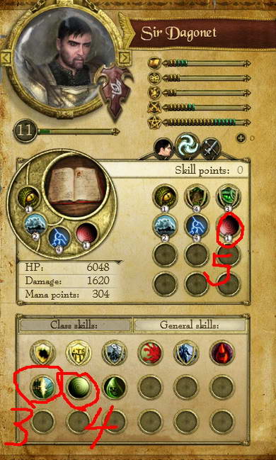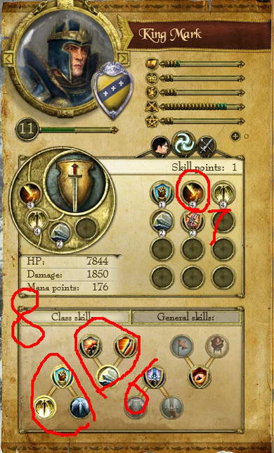 推荐搭配:单体被动技能如针对对方英雄近卫队的伤害性技能等,主动性机能选择,红圈标志6 这是朴实无华的技能,但从它的说明和效果可以看出这套技能已臻大巧若拙、返璞归真的境界,4级时耗魔60,持续45秒,冷却60秒,每次攻击相当于攻击5次,两个分支被动技能则分别给它加攻速和范围,满级应该能达到+60%攻速和+25米伤害范围半径……话说有很多装备都有给这个技能加成,如果收集给它顶到8级那这个技能汉化时就可以直接考虑翻译成“独孤九剑”了哇嘎嘎嘎嘎……恩……原来这款游戏的作者是个外籍金庸迷……红色标志7 是一招“火龙斩”,这是清兵的绝学,伤害非常令我满意,推荐必修,红圈标志8 这个是分支技能出的话会出2个主动,金色翅膀那个是增加回避攻击次数,白色翅膀是区域削减敌人攻速和移动速度,这两个技能是分开的,并非同一技能支流。