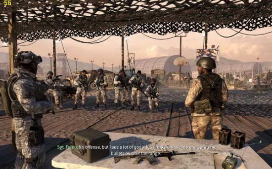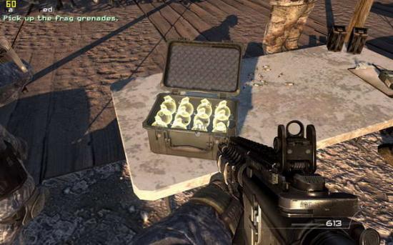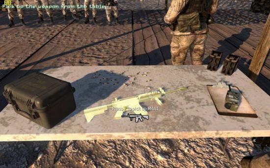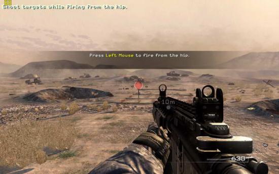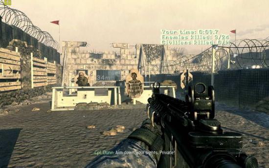 这一关是训练关(图1),主要的目的是熟悉操作。你扮演的人物是美军士兵Allen,按F捡起面前的枪(图2),然后转身面对靶子,要分别按照提示完成射击靶子(图3),蹲下设计靶子(按C),蹲下瞄准射击靶子(图4),透过木板射击靶子,拿起手雷并扔手雷(图5)。这一代没有侧身设置了,Q键改为了特殊手雷,E键改为肉搏,应该说更方便操作了。完成练习后去坑道里找士官(图6),先按照提示练习切枪(1和2键)然后跑一个测试,在测设中要注意不要伤害平民(图7),上楼的时候有一个敌人挡在面前要用肉搏消灭。完成后可以根据自己的情况选择难度,之后集合出发