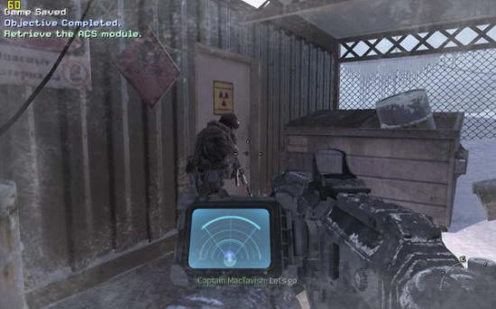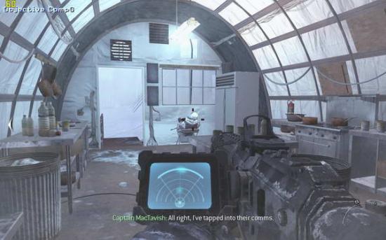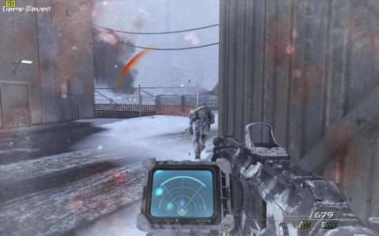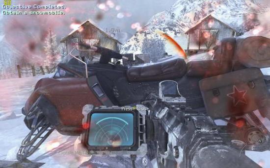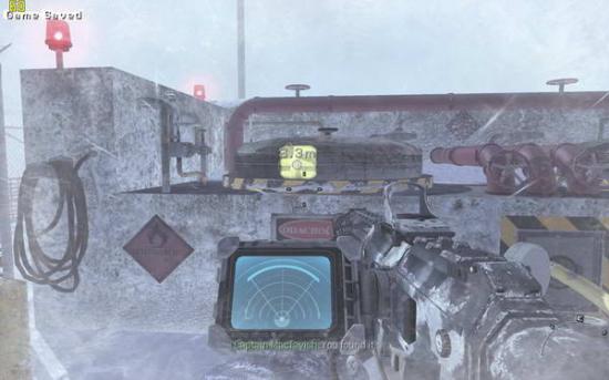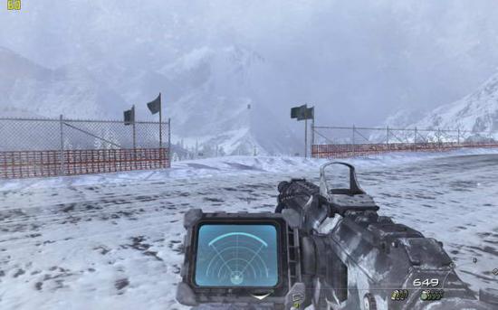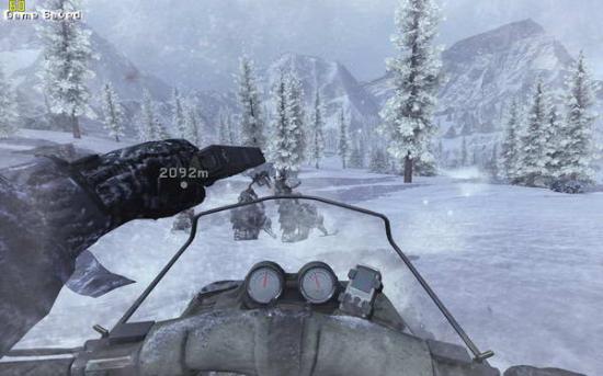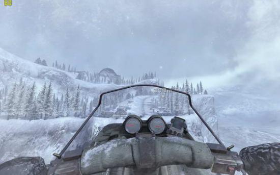 之后跟随soap前进,打开心跳成像仪(3),上面的团团就是敌人,前面有两组巡逻队,听候soap的指令把他们消灭掉,之后再前进就进入冰风暴中了,需要按照心跳成像判断敌人所在。到有一个睡觉的敌人的小屋里面拿上C4(图3),然后你可以选择按照soap的提示避开敌人向任务点前进,也可以一路冲杀过去。在那里安装C4(图4),回来跟soap会和(图5),跟着soap去一个仓库里面,到二楼拿取零件(图6),出来的时候发现soap已经被敌人包围,在敌人倒数计时结束之前按动c4开关并杀光敌人(图7),然后跟着soap夺命狂奔(图8),在一个下坡处(图9)缴获雪地摩托(图10),迅速上车前进,这里要注意是及时消灭敌人(左键开枪,要对准)(图11),并且躲避树木,最后在一个很长的下坡处一定不要减速,否则无法飞越过尽头的断崖(图12)。飞跃断崖之后登上直升机任务结束