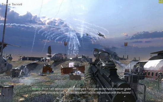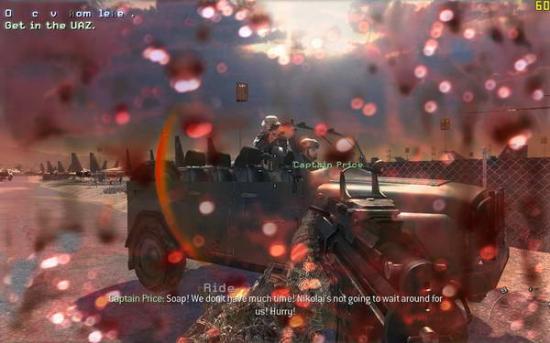 Roach死了,另一边的price和soap也陷入苦战,本关我们再次回到了上代主角soap身上。但是面前的局势一片混乱,马卡洛夫的人和Shepherd将军的特种部队战做一团,而你则要在他们之间求得生存。建议沿着左边的飞机残骸前进(图1),这样掩体比较多,同时留心追着你的敌人从后面把你放倒,这样一路跑下去问题不大(图2),到了后面会有追击你的汽车,优先把上面的机枪手消灭否则很难逃生。最后到达了跑道上,上了price的车(图3),回到了经典的公路追击—不过这次追你的是两股势力。努力消灭了敌人后,尼克莱的C130近在眼前,谁知司机却被流弹打死,不得已soap控制起车子(图4),小心不要让敌人的车子把你撞失控,把车子开进飞机,就可以了
