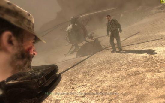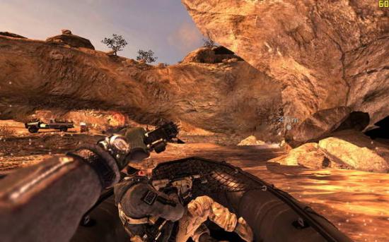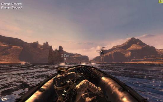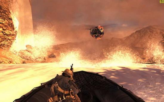 Shepherd将军已经乘上快艇逃走,你也要和price赶快登上另一艘快艇追击(图1),还是按W前进,左键开枪,但是这手枪威力也太大了吧(图2)。。。之后到达开阔的地方后,还会有直升机加入战斗(图3),小心躲避火箭弹,听到minigun枪响以后赶快转向躲避!之后到了激流地带(图4),更加难以控制了,再加上敌人的快艇和直升机,以及Shepherd将军登上了直升机。。。oh my god!price你要干啥!小心的帮price稳好船。。。看着他扣动扳机,是的!price击落了Shepherd将军乘坐的直升机!(图5)但是这时快艇已经到了悬崖边上,price和soap一起坠落瀑布。。。。