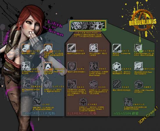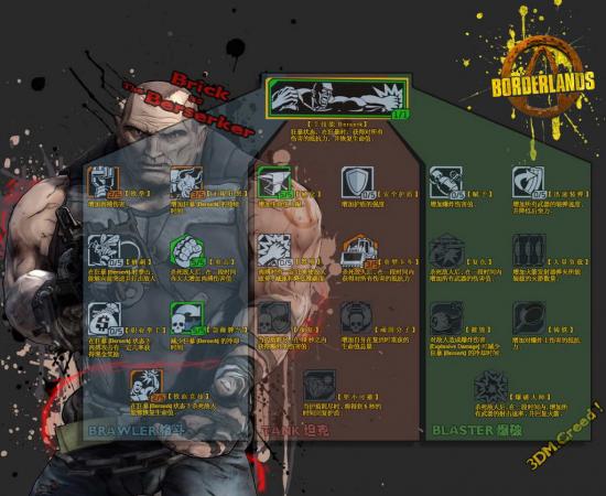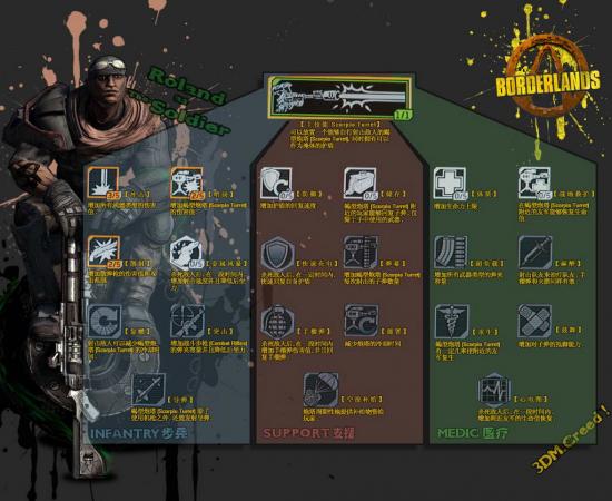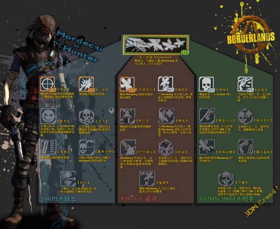 Borderlands技能资料收集自外国论坛,英语水平有限,技能名称多有不贴切之处,请以实际游戏为准~翻译了各职业的技能名称和技能描述,并仿照游戏中的技能树,做成图片供同学们浏览.关于技能不同等级的具体数据,资料尚不完整~